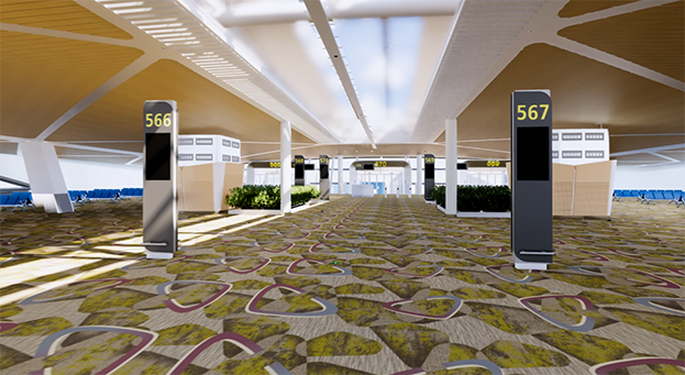 衛(wèi)星廳雖然是T3航站樓國內候機指廊的延伸,但也需要體現其內在價值和特色。與T3航站樓相比,衛(wèi)星廳建筑規(guī)模和體量都小。衛(wèi)星廳以實用性和旅客體驗為特點,因此更適合采用木色等天然材質的作為空間主要色調,積極打造深圳機場衛(wèi)星廳為一個明亮、溫馨、具有自然質感、親切的航站樓。鋪地主要采用整體無縫磨石地坪、高端無機人造石、地毯打造,鋪地根據建筑功能,整體無縫磨石地坪主要分布三層及二層中央出港區(qū)域,地毯主要分布在三層各個指廊候機區(qū)域。其余區(qū)域鋪地為高端無機人造石。